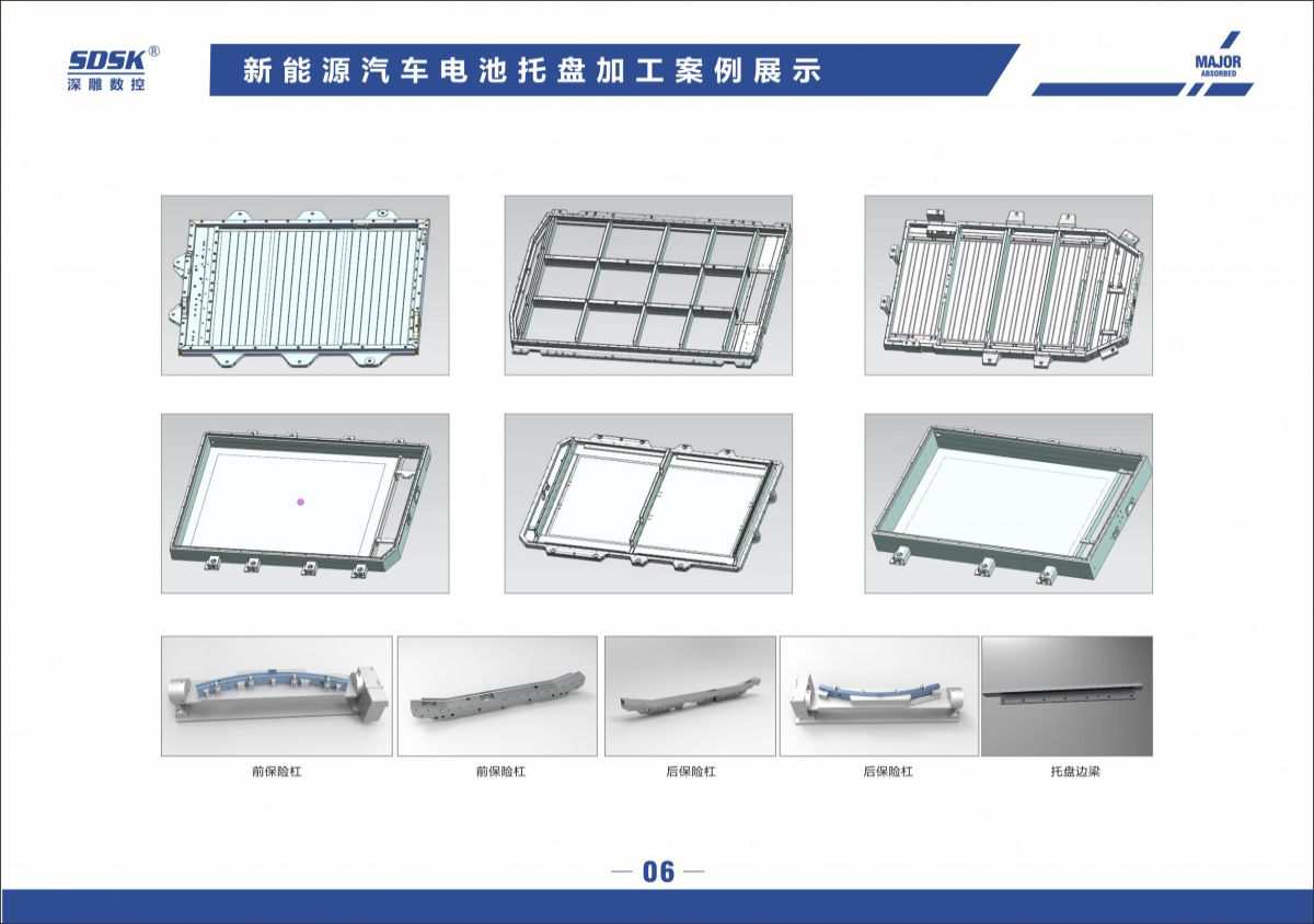 應用加工領(lǐng)域:新能源電池托盤加工/航空航天細長零配件/機翼配件磁懸浮高鐵行李架/電池盒/鋁通風裝置/燈源主體前燈鋁制品